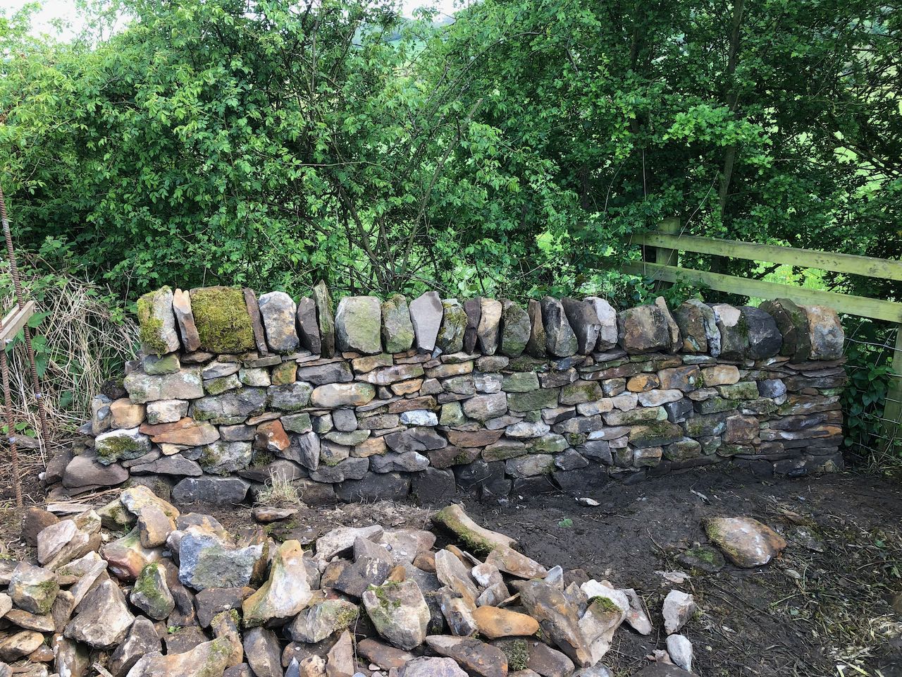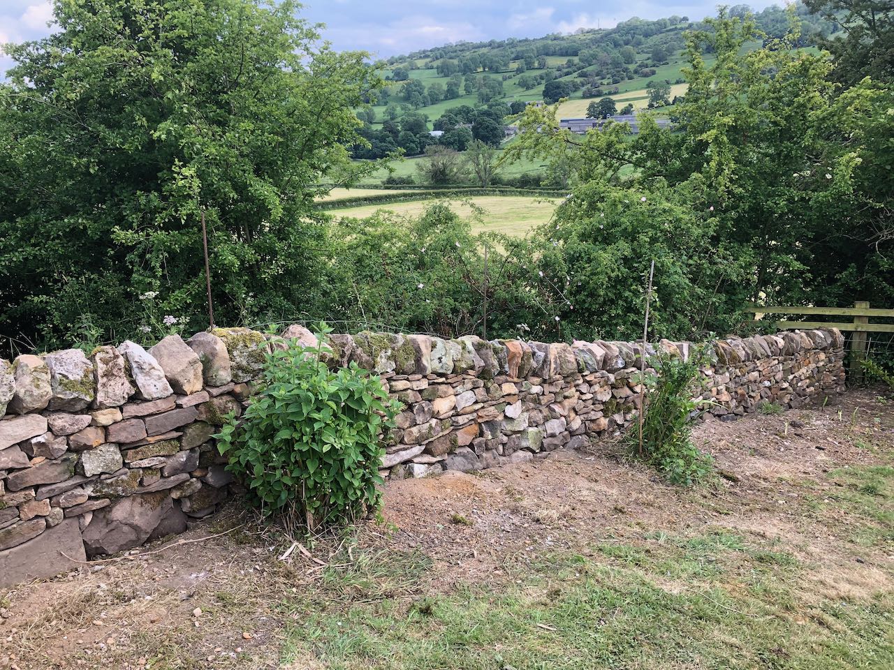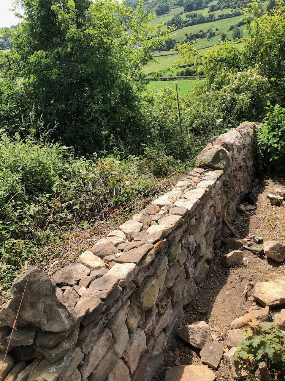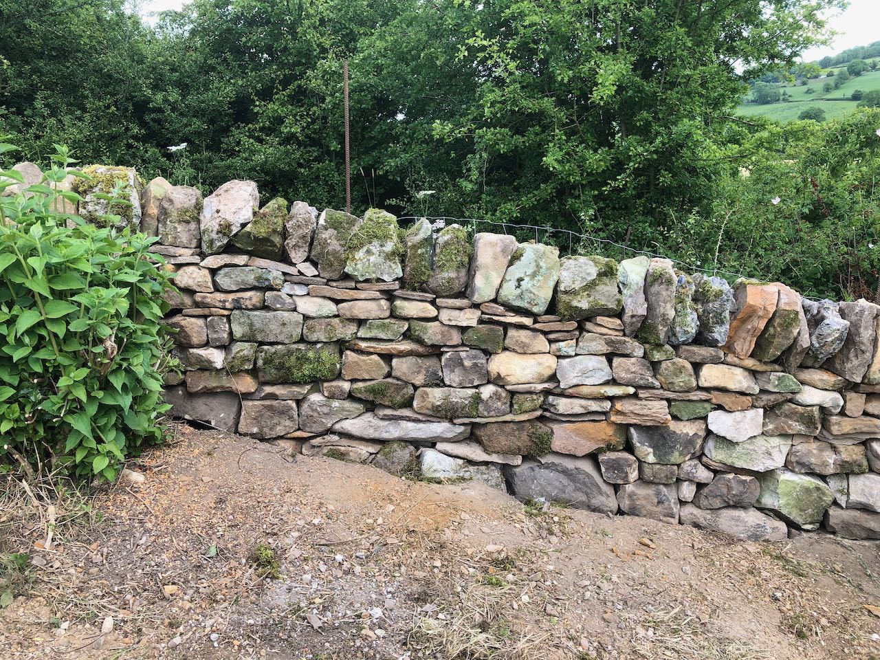 This newly renovated house has a garden boarding farmland. There was therefore an old drys stone wall that had become derelict and the owner was keen to restore it. It included a quite steep section that needed particular attention.
