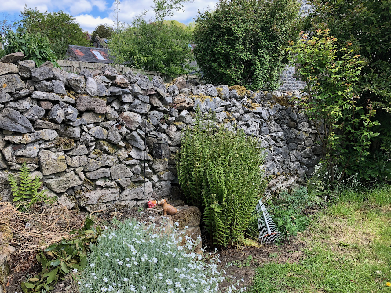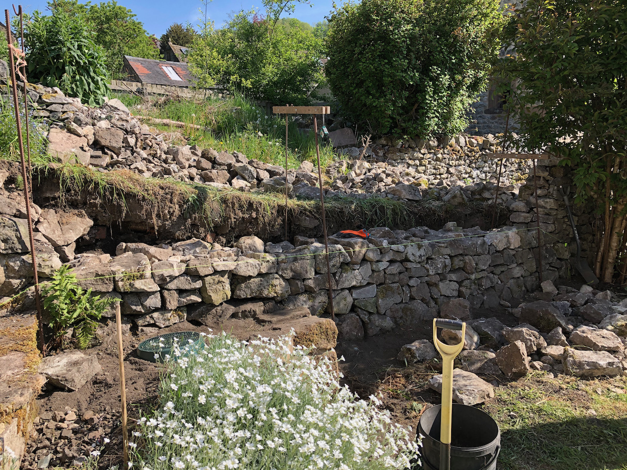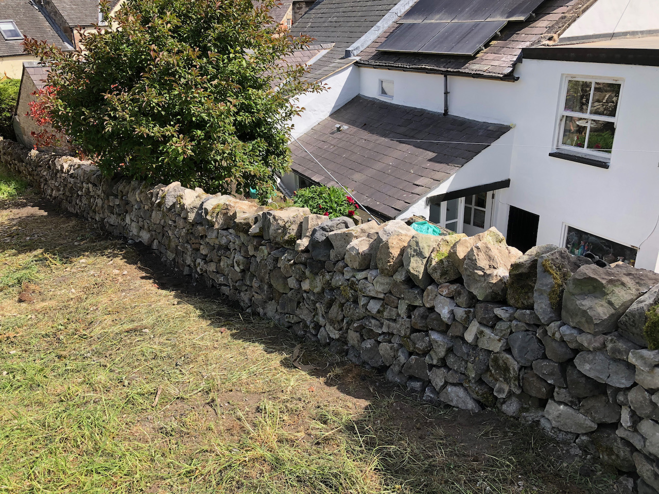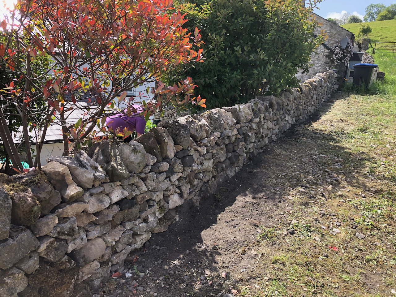 This garden drystone wall in Bonsall, Derbyshire, serves as a retaining wall for the higher land beyond the end of the garden. The owner felt that the old wall was not up to standard so we stripped out and rebuilt the wall.