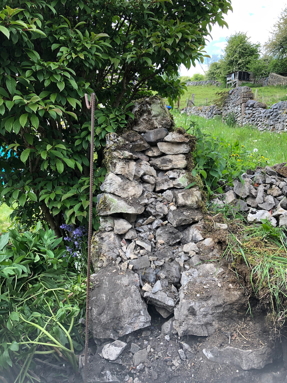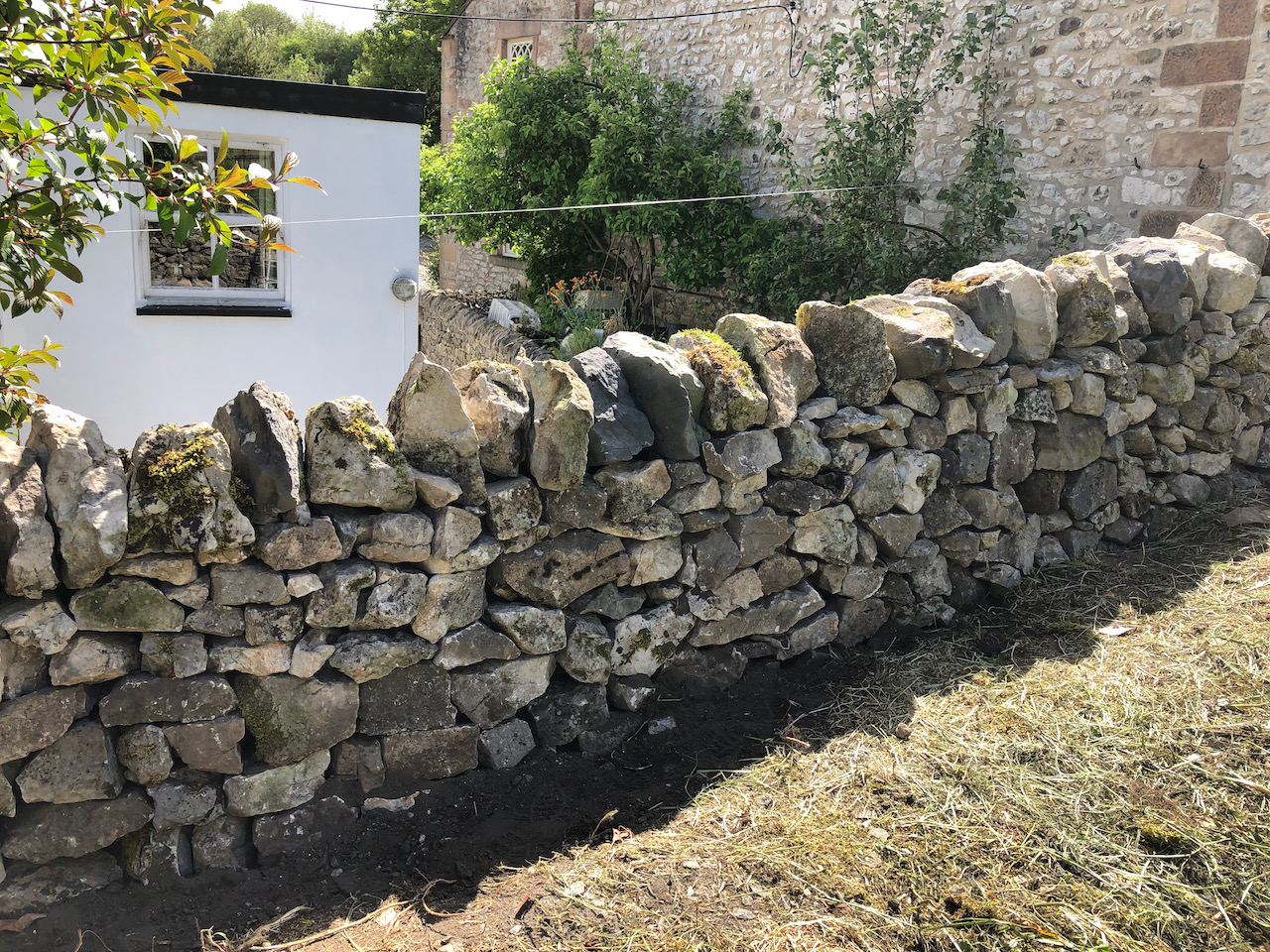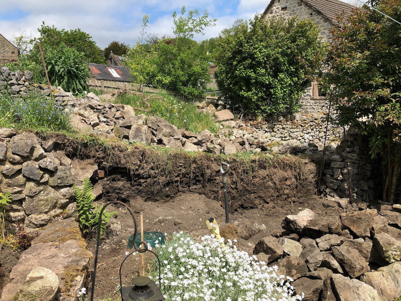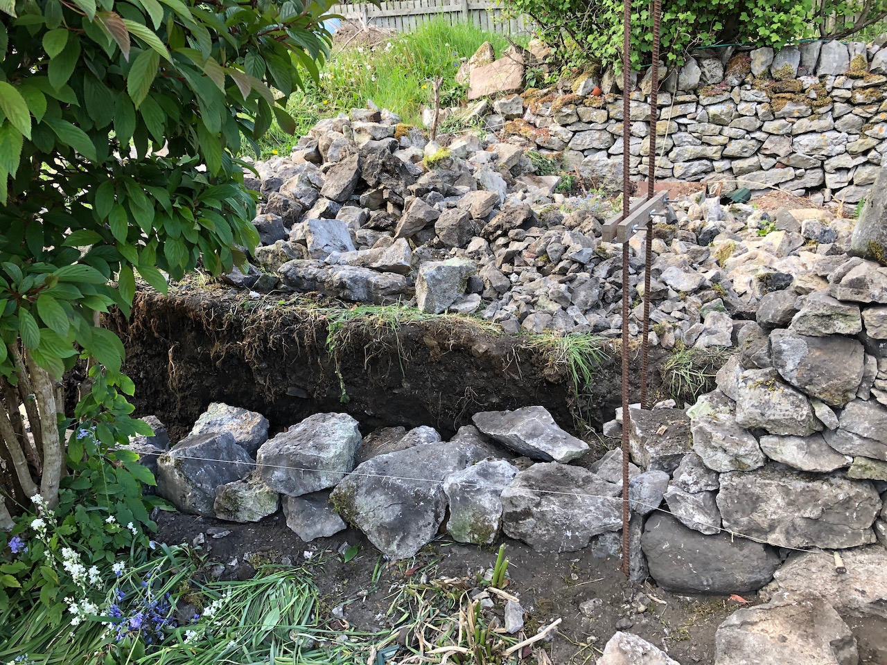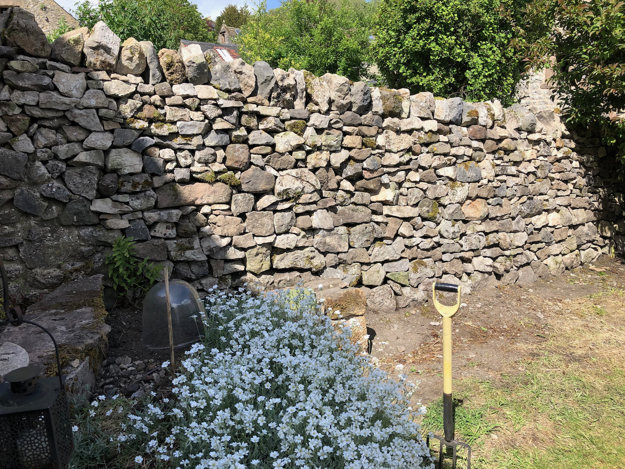 This garden drystone wall in Bonsall, Derbyshire, serves as a retaining wall for the higher land beyond the end of the garden. The owner felt that the old wall was not up to standard so we stripped out and rebuilt the wall.