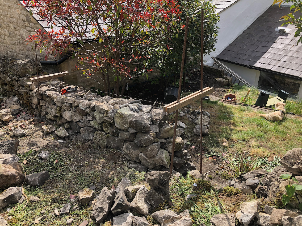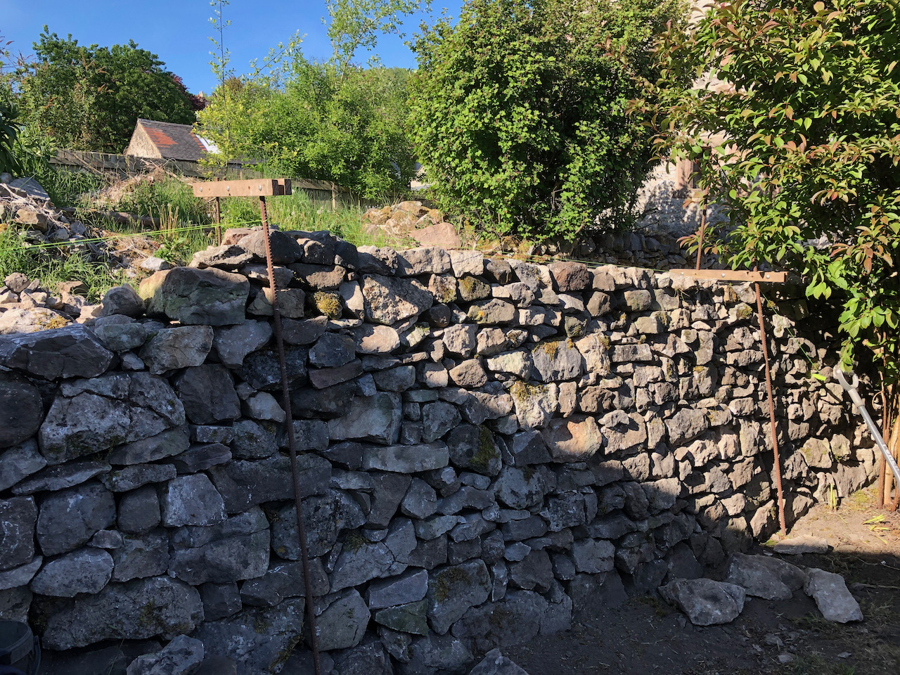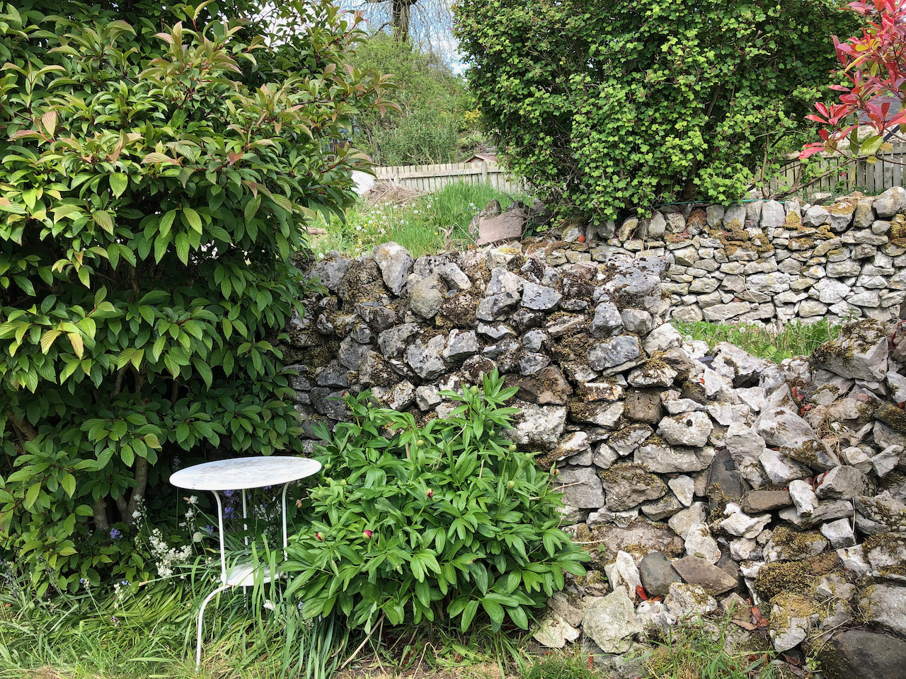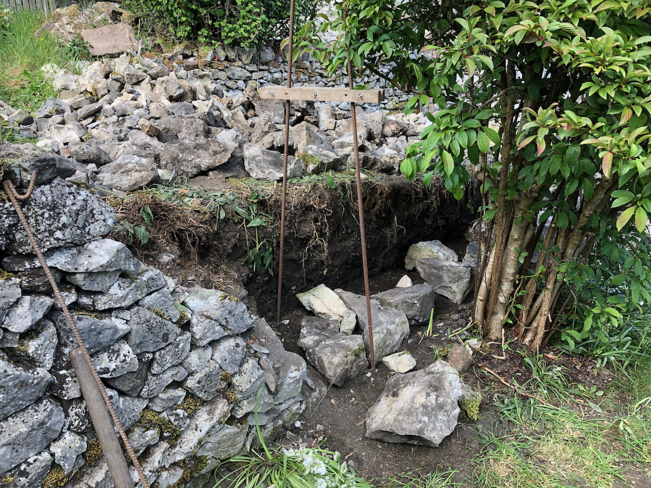 This garden drystone wall in Bonsall, Derbyshire, serves as a retaining wall for the higher land beyond the end of the garden. The owner felt that the old wall was not up to standard so we stripped out and rebuilt the wall.